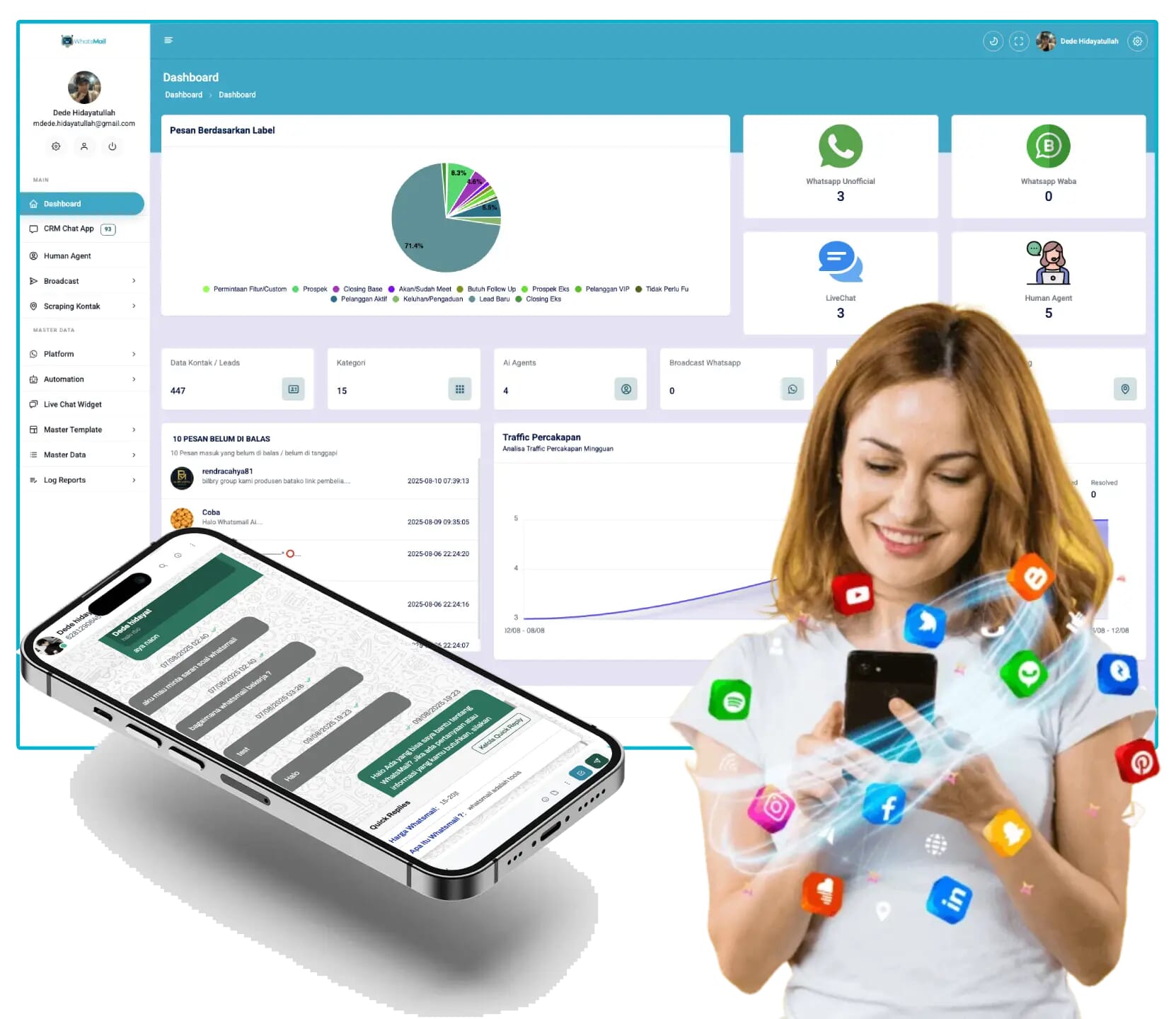 Automasi chat, kelola pelanggan, closing penjualan, hingga bangun bisnis software sendiri—semua dari satu dashboard Whatsmail
